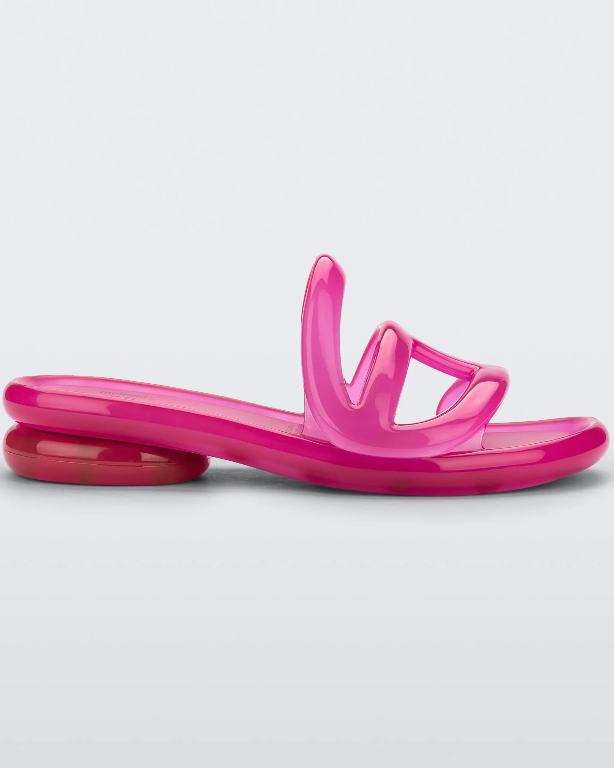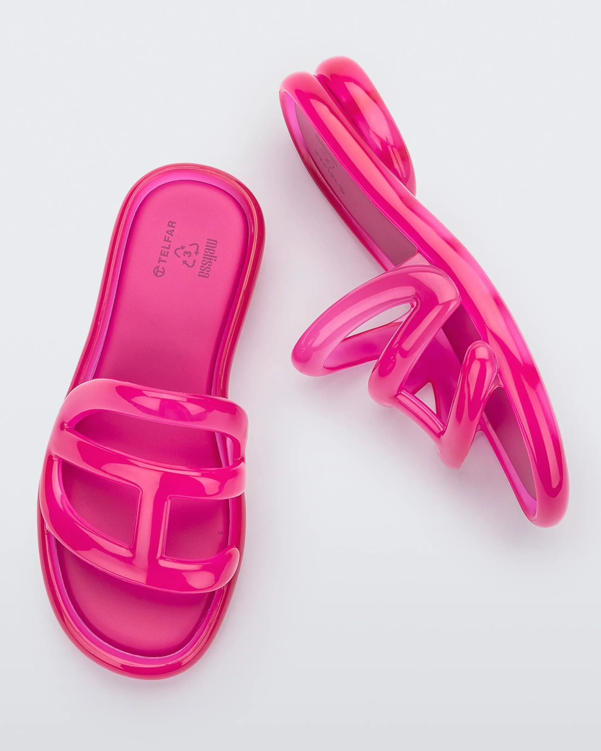 The Melissa x Telfar Jelly Slide — features a tubular design forming a logo strap before snaking around the foot and under the heel for a little lift. This slide is an instant icon molded using Melissa’s exclusive Melflex material.